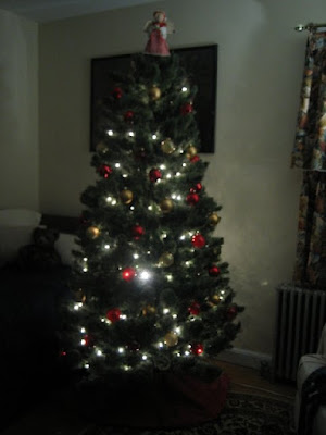 This seemed easy enough to accomplish. We own an artificial tree from our days of living in an apartment (real trees are considered a fire hazard and thus were banned by our landlord). It has been sitting up in the attic since we bought our house. I drug it down from the attic and set it up in our guest bedroom. It is the first thing you see when you walk into the room.